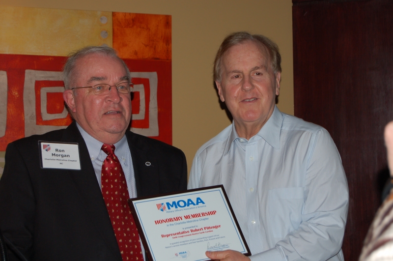 President Ron Morgan presents March guest speaker, U.S. Congressman Robert Pittenger, with an Honorary MOAA Membership Certificate.