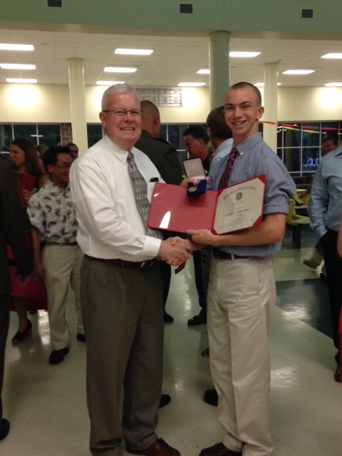 Scott Morris, Col USA Ret, presents the MOAA JROTC Leadership Award to Weddington High School's Francis Grippo in May 2015.