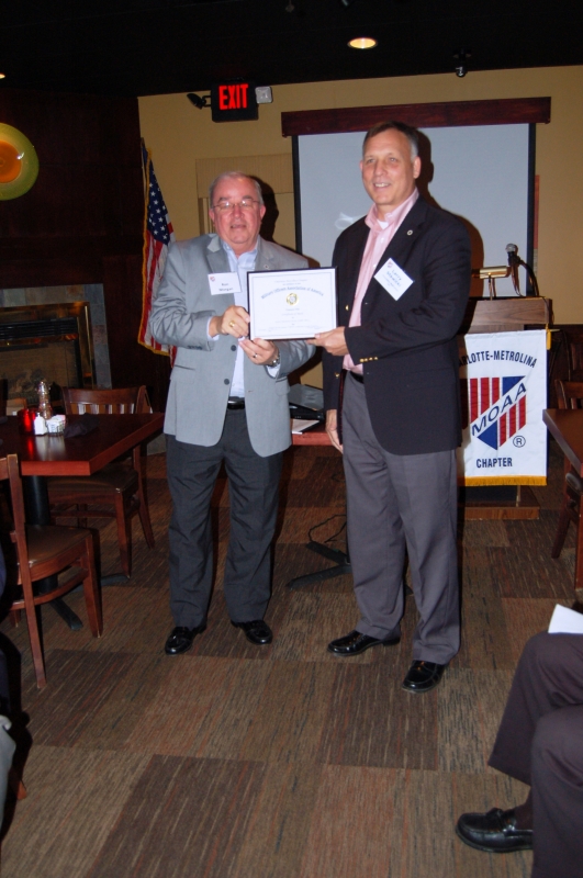 President Ron Morgan presents The Chapter's Certificate of Merit to Larry Stawicki for his many years of administration and support of the MOAA Leadership Awards Program to the 34 Charlotte Area JROTC Units.