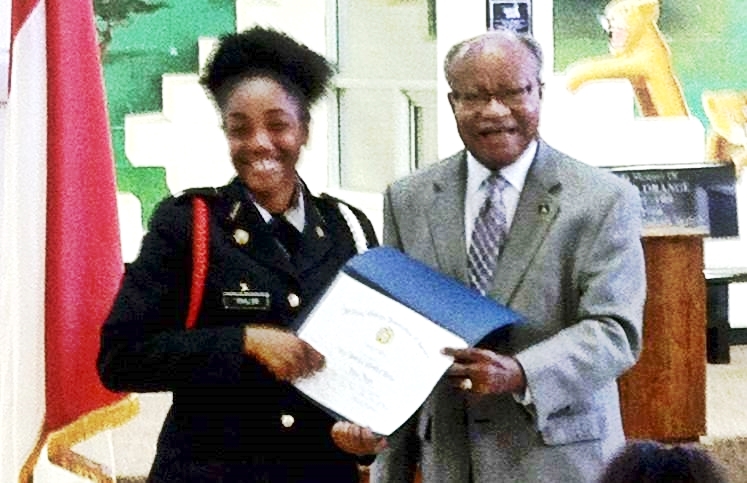 1462891226 / 0/ JROTC Award Ceremony West Charlotte H.S. - May 2016 LTC (Ret) Joe Anderson presents the MOAA Cadet Award to Cadet Enumi Taylor. Tweet Feedback Post Info Posted May 10, 16 by Webmaster Under People Permalink 1462891226